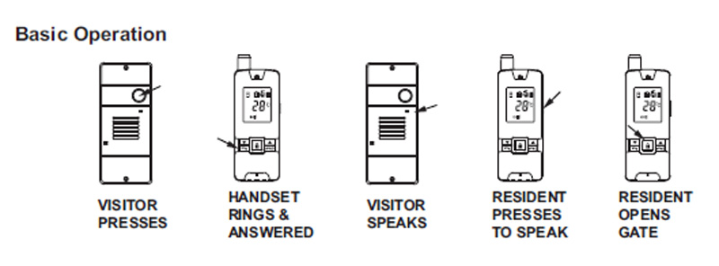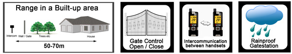 Communication is initiated from the gatestation by pressing the bell button. All the handsets linked will ring and communication is established. Communication is simplex so only one person can speak at a time but the gatestation’s microphone is always active so the visitor does not have to press any key to speak. The inside handset can enter into the conversation at any time by pressing a PTT button.
