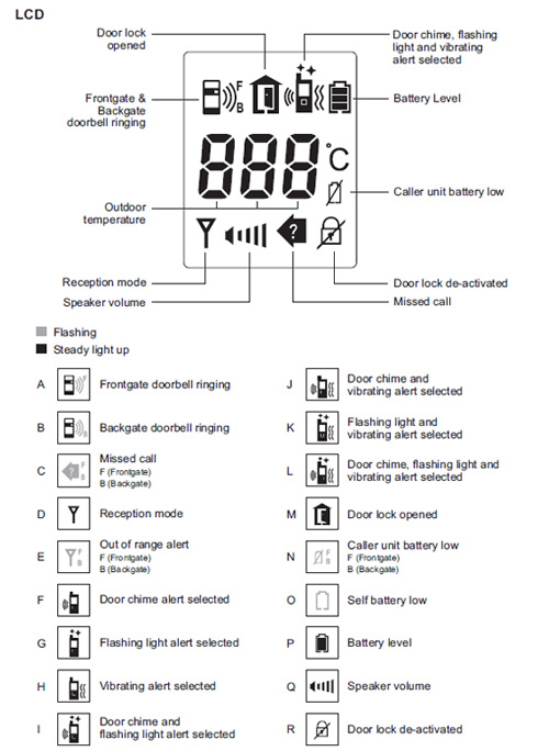 Additional (back) gate stations can be added on the system to ring the same handset/s. When a handset is on a call with a back gate, a B will show on the screen and the relay on that Gatestation can be triggered during the call