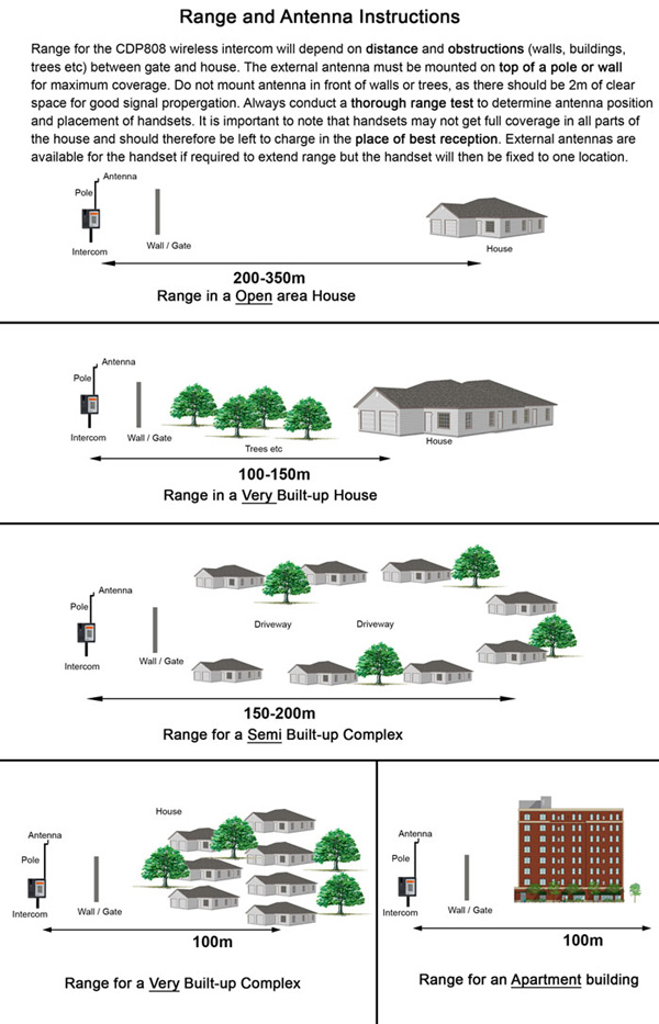 If there are many walls, trees and buildings between gate and house it is advised to use the ZA-613-E handset where an external antenna is connected to the handset for clearer reception. The handset will then be fixed to one location and not portable.