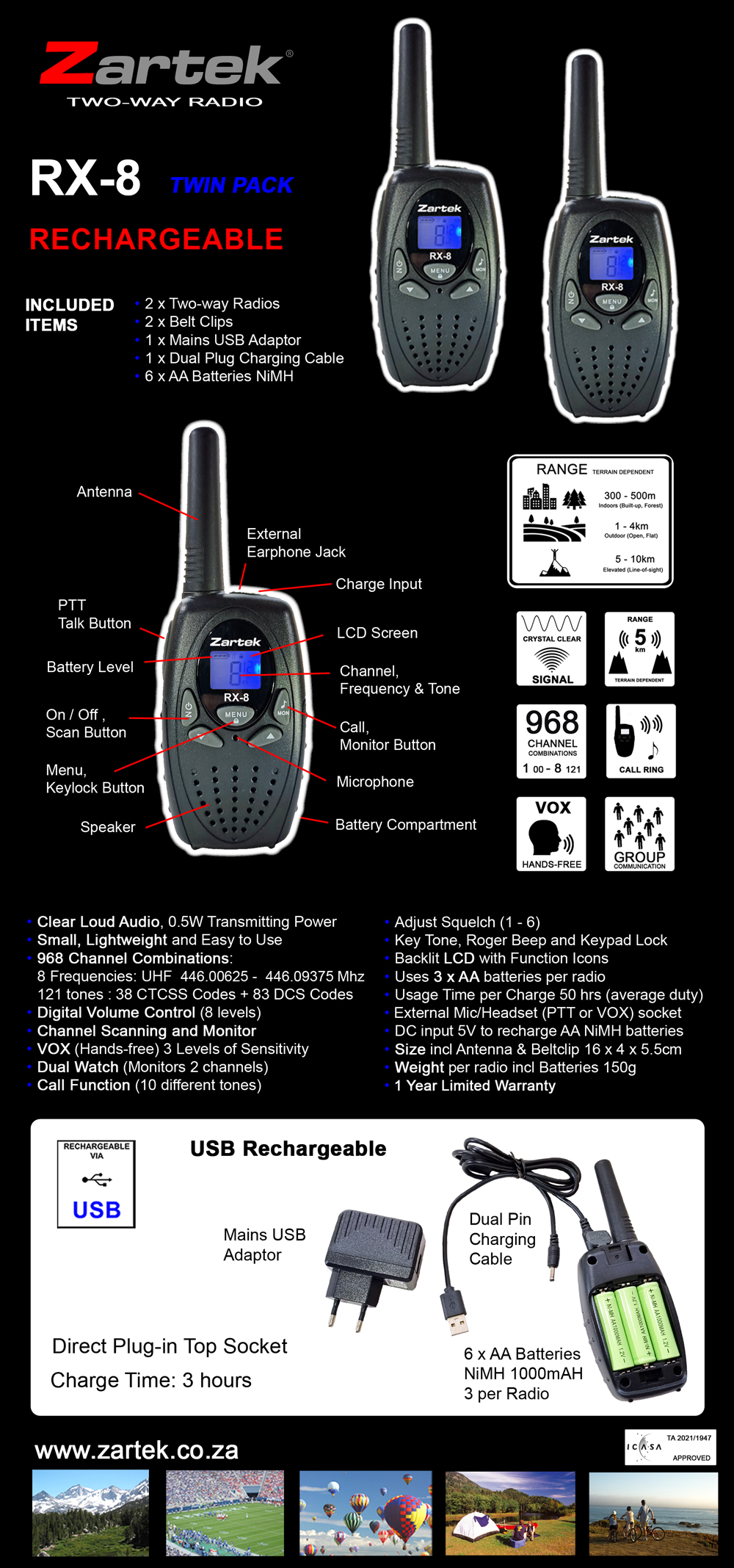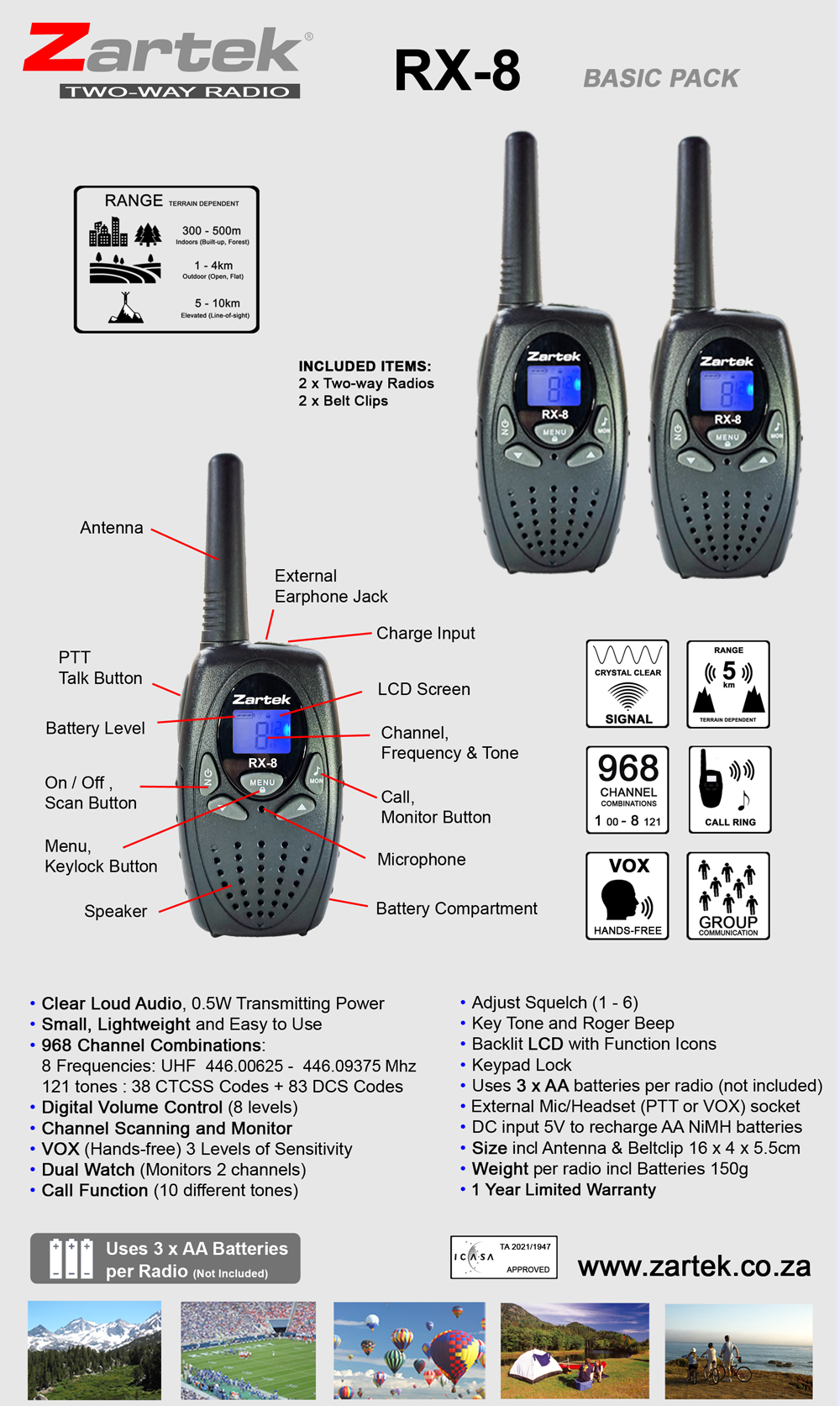 - Uses 3 x AA batteries per radio