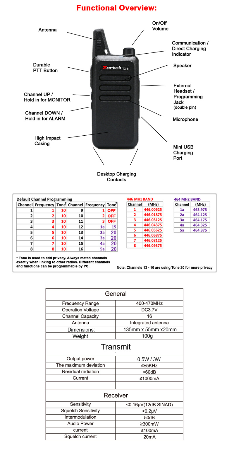 Zartek ZA-748, ZA-758, ZA-725, ZA-705, ZA-708, COM8 & Pro8 Radio (446 MHz)