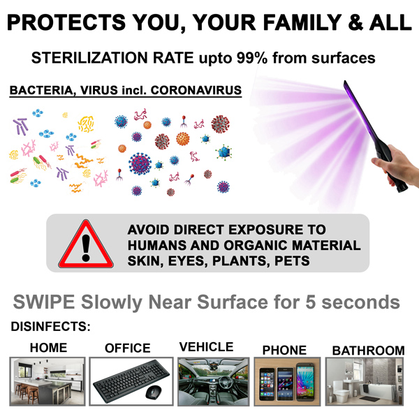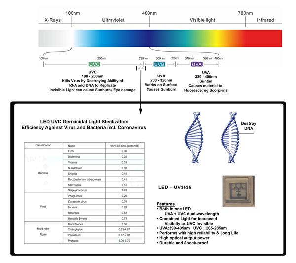 Germicidal effect up to 99.9%. UVC light with wavelength around 270nm destroys the molecular structure of DNA or RNA in viruses.