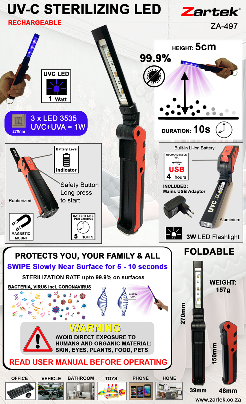 Effective: Germicidal effect up to 99.9%.UV-C light with wavelength around 270nm destroys the molecular structure of DNA or RNA in viruses.