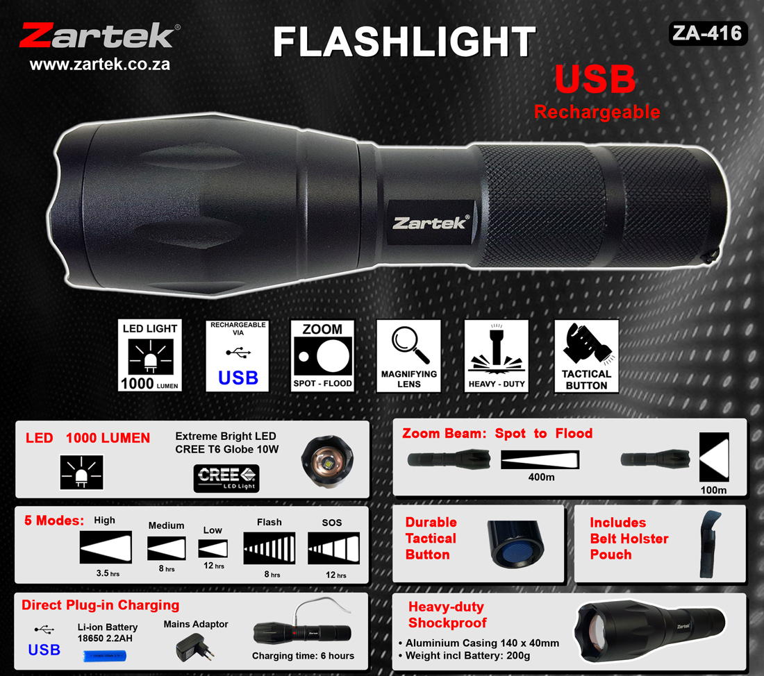 ZA416 ZA-416 Zartek torch flashlight zoom USB rechargeable Lumen 1000 lumen LED li-ion rechargeable