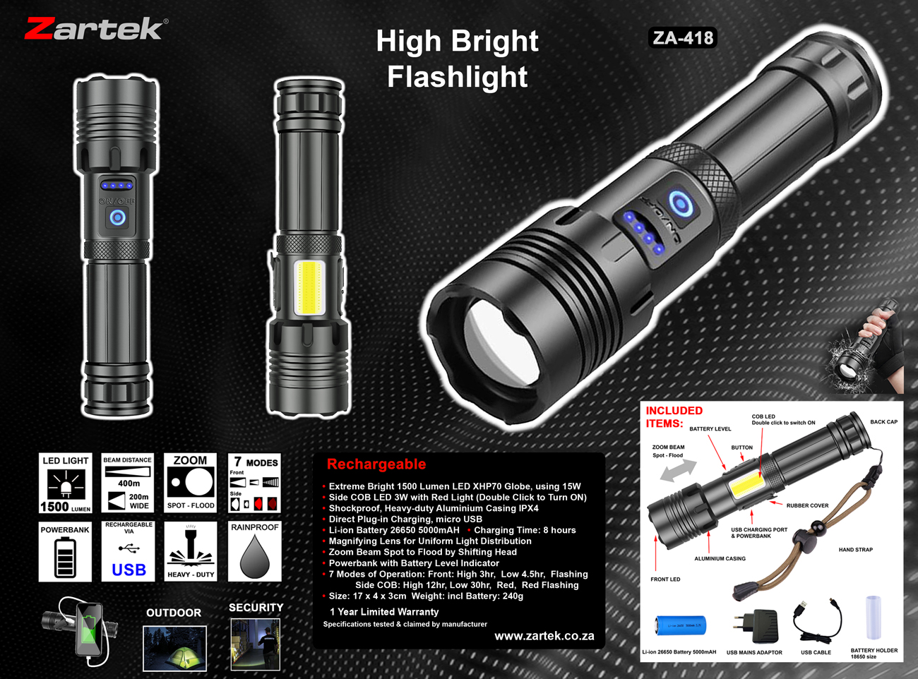 ZA-418 USB Rechargeable LED Extreme Bright Flashlight
