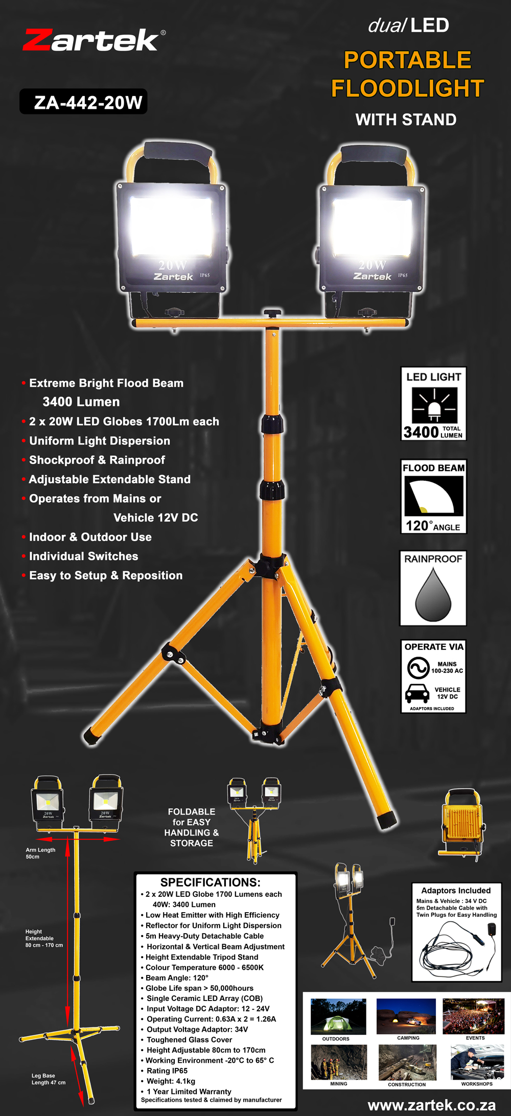 Included items:    2 x LED Floodlights (20 Watt each),   Tripod stand with arm and bolts,     Mains & vehicle adaptor with 5m cable