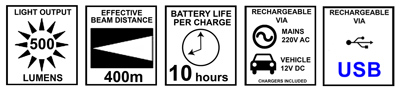 • 500 lumen & 400m beam distance