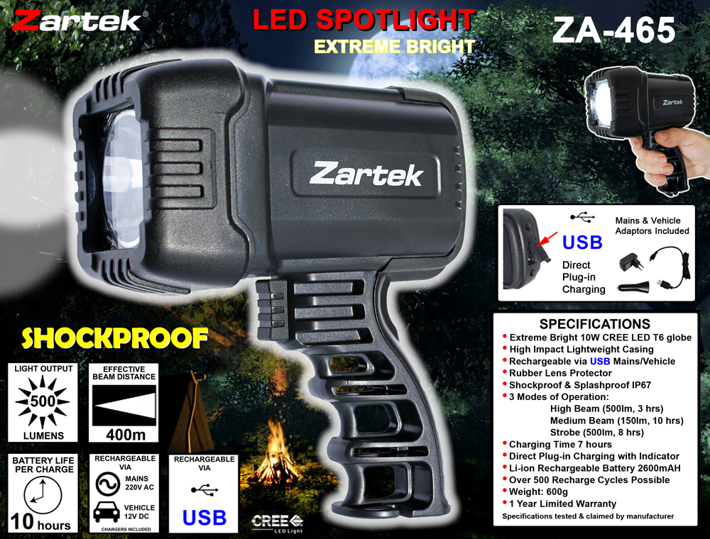 • Rechargeable via USB mains or vehicle charger included