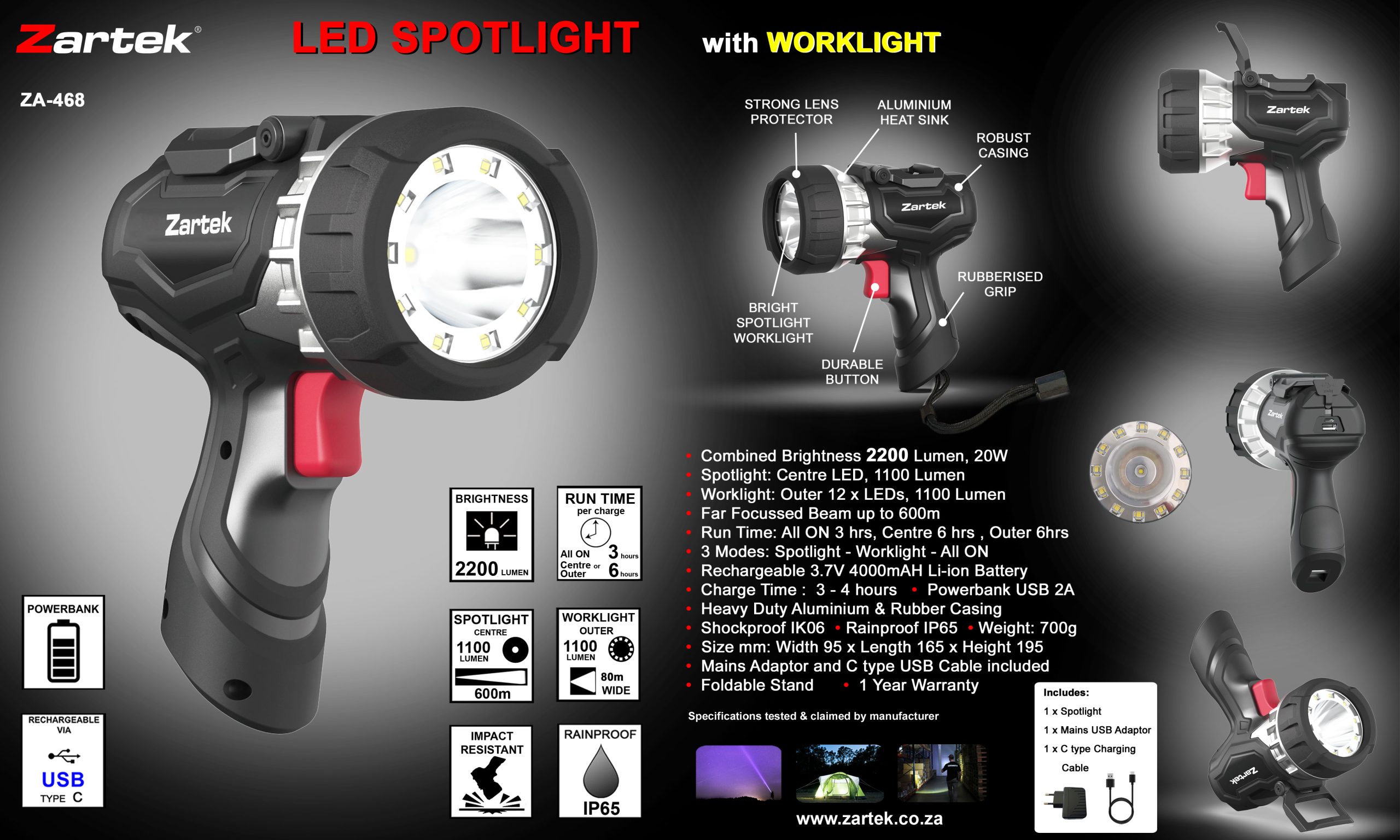 1 x LED Spotlight, 1 x USB Mains charging adaptor, 1 x USB charging cable