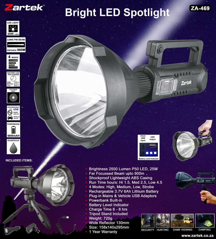 1 x LED Spotlight, 1 x USB Mains charging adaptor,