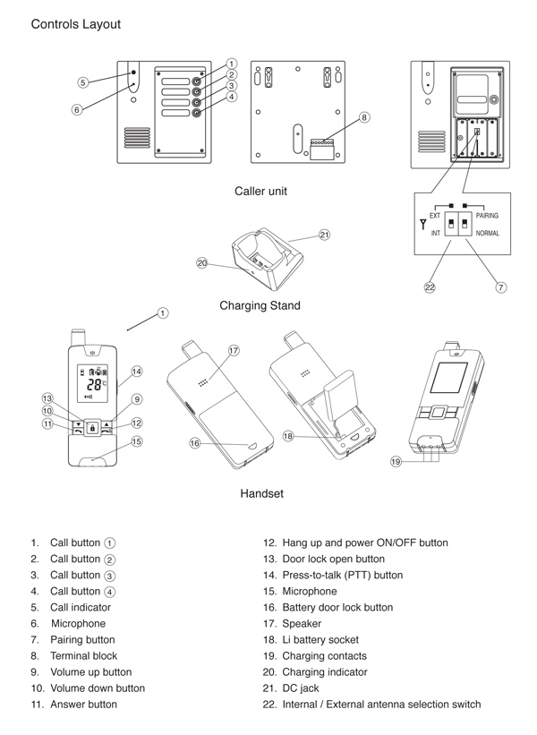 Each of the four buttons on the gate station can be linked to separate handsets to be called individually. There is no intercommunication between handsets linked on different buttons.
