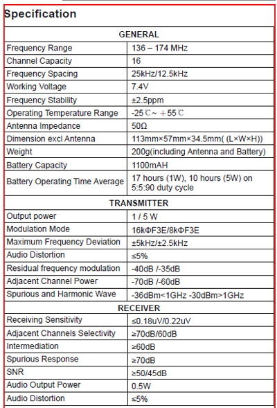 - Power Output 1W / 5W Selectable
